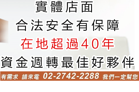 日常生活中面對突如其來的資金需求可能會讓您不知所措!免煩惱,生生當舖幫助您解決困難,是您週轉的最佳選擇。《 生生當舖有店面有保障 》汽車 、 機車 、 黃金鑽石 、 勞力士名錶、各項周轉服務盡量滿足所需,生生當舖讓您借錢不必看別人眼色。台北當舖-松山當舖-內湖當舖-松山汽機車借款-內湖汽機車借款.