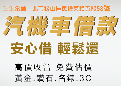 【生生當舖】在地服務四十年,提供各類借款、合法、安全、可靠為政府立案合法當舖,是台北當舖首選之優良當舖。專辦台北汽機車借款(松山汽車借款/松山機車借款)服務,黃金、鑽石、勞力士名錶等動產質押借錢,上班族典當週轉及公司/工廠及中小企業融資等金融諮詢服務。其實只要找對借款管道,就可順利解決所有資金窘境,生生當舖依照各位的需求,在您急須週轉的關鍵時刻,給您最專業最快速的服務。且在內湖汽車借款,內湖機車借款,讓您方便是我們的服務宗旨,法定利息,迅速撥款,親切保密,合法執照,週轉安全有保障。