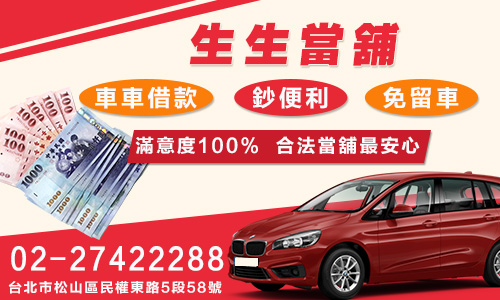 急需資金?當舖借錢助你度過難關!臨時【急用】【周轉】【借貸】找生生當舖,松山當舖,台北當舖,汽車借款,機車借款,提供各類借款、合法、安全、保密、是政府立案合法當舖,專業服務台北汽車機車借款服務,黃金、鑽石、勞力士名錶等動產質押借錢.【生生當舖】秉持著專業、誠信、便利、迅速、的經營宗旨及透明經營、誠信助人為原則,為各行各業有資金需求的人,提供最立即的服務.